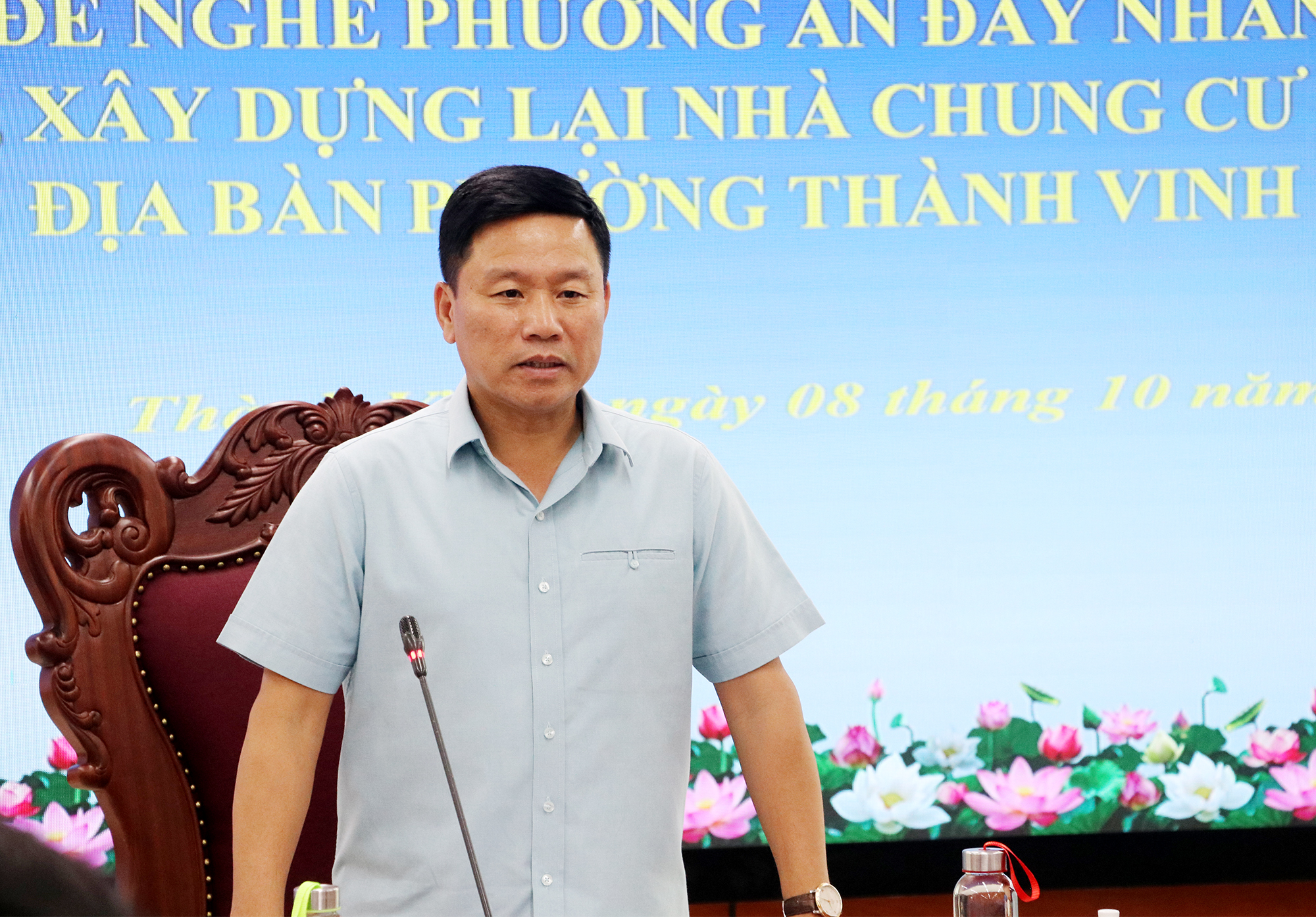 Chiều nay (08/10), Phó Chủ tịch UBND tỉnh Hoàng Phú Hiền đã có buổi làm việc với lãnh đạo UBND phường Thành Vinh, Sở Xây dựng và các Sở, ngành, đơn vị liên quan và Chủ đầu tư để nghe phương án đẩy nhanh tiến độ cải tạo, xây dựng lại nhà chung cư cũ trên địa bàn phường Thành Vinh.