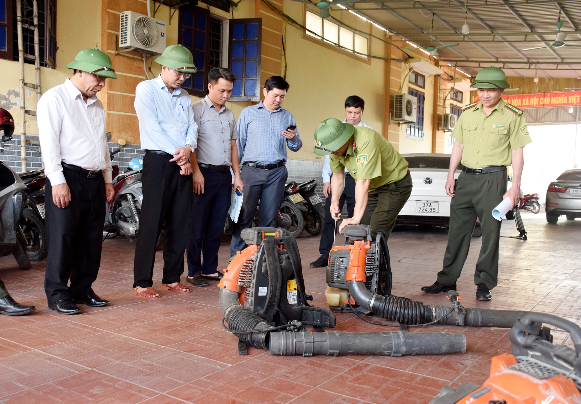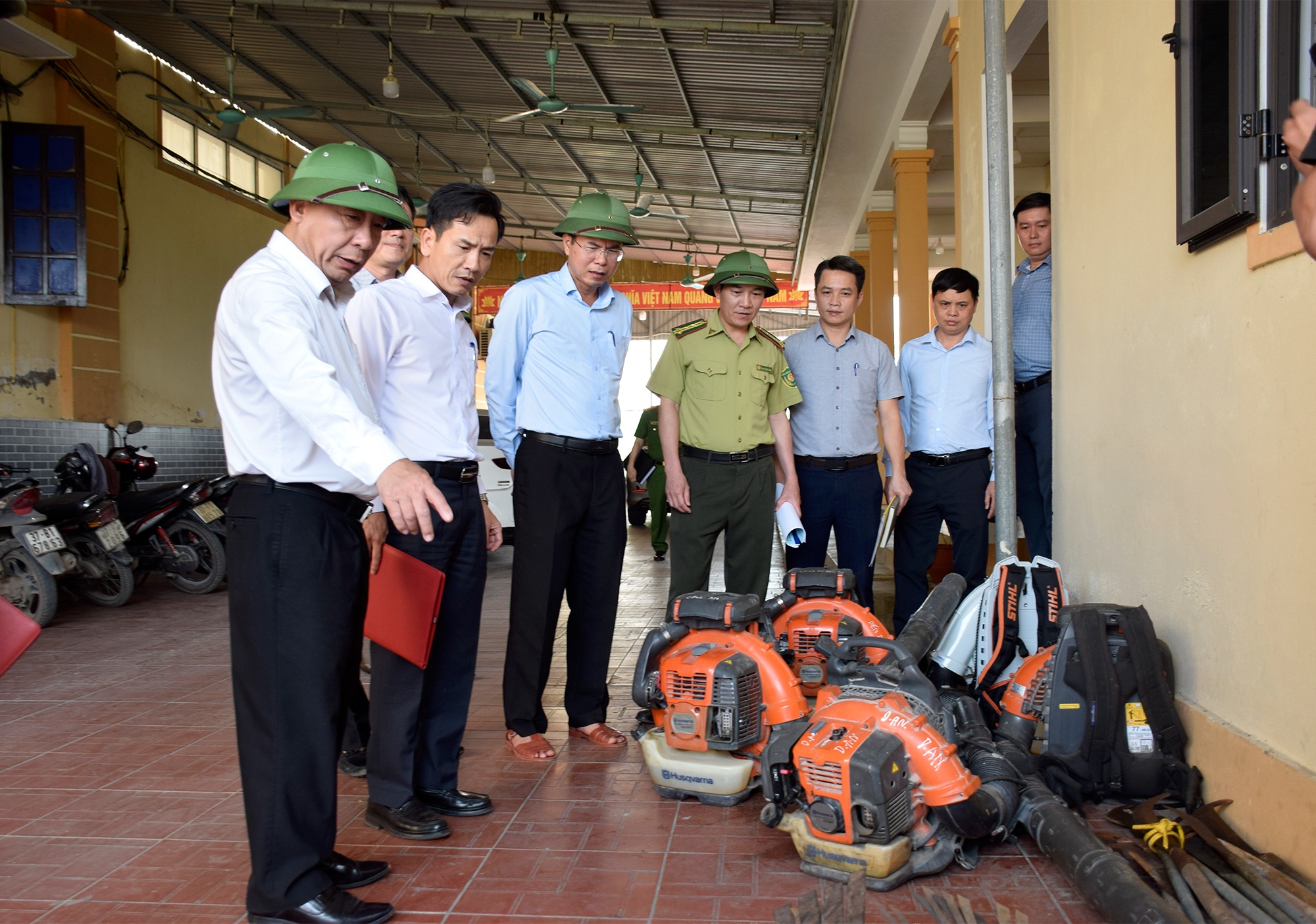Phó Chủ tịch UBND tỉnh Nguyễn Văn Đệ cùng đoàn công tác kiểm tra dụng cụ chữa cháy rừng của xã An Châu |