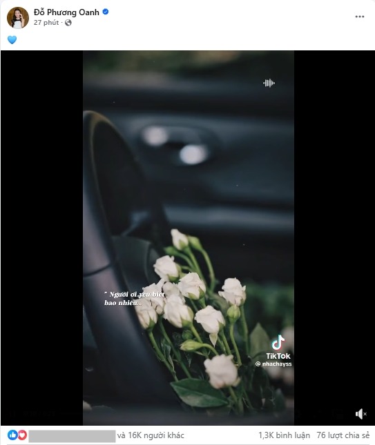 Cô đăng 1 icone hình trái tim màu xanh dương, kèm clip từ TikTok có lời bài hát của ca khúc Ánh Trăng Nói Hộ Lòng Tôi (nhạc ngoại, lời Việt): "Người hỏi em có yêu người đậm sâu. Người ơi yêu biết bao nhiêu. Áng tình này chẳng rời, dấu yêu này chẳng đổi có ánh trăng là lời trái tim...".