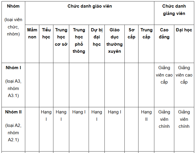 Theo Thông tư, các chức danh nhà giáo được xác định tương đương quy định tại Phụ lục kèm theo Thông tư này. Trong đó, các chức danh nhà giáo trong cùng nhóm được xác định là các chức danh tương đương. Cụ thể: