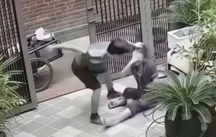 Đoạn video ghi lại cảnh người chồng đánh vợ dã man ngay ngoài cổng - Ảnh cắt từ clip |