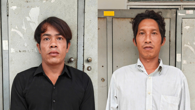 Danh Thiện (trái) và Nguyễn Tấn Được tại cơ quan điều tra. Ảnh: Dương Đông |