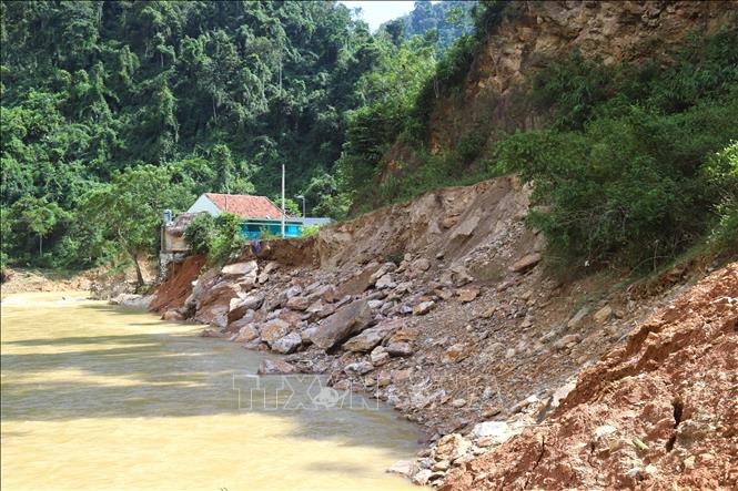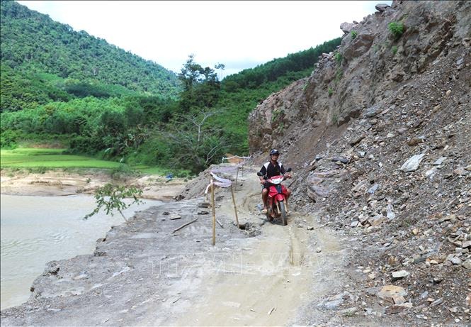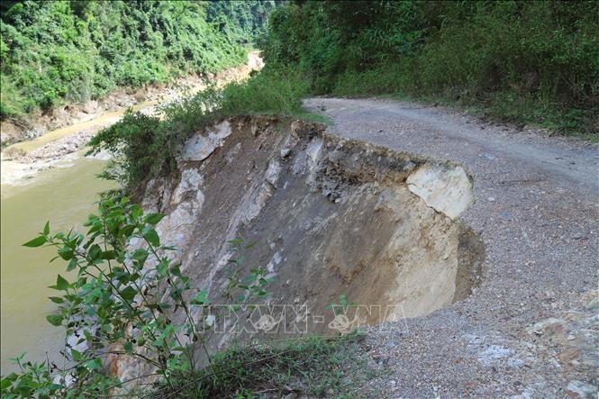 Một điểm sạt lở vách núi và sụt trượt ta-luy âm trên con đường độc đạp đi vào các bản Canh, Xốp Kho, Na Kho, Na Ngân (xã Nga My, tỉnh Nghệ An), chỉ phương tiện xe máy mới có thể lưu thông trong điều kiện rất khó khăn, nguy hiểm. |