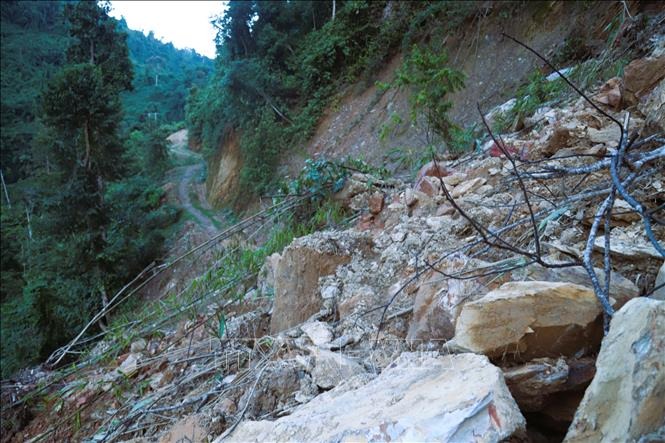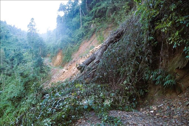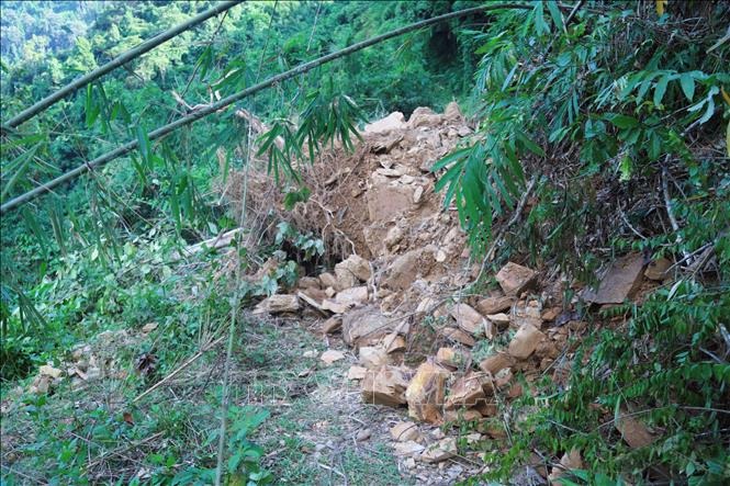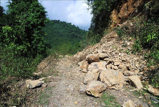 Đá và cây rừng đổ xuống, phủ kín mặt đường trên con đường độc đạo vào bản Na Ngân (xã Nga My, tỉnh Nghệ An). |