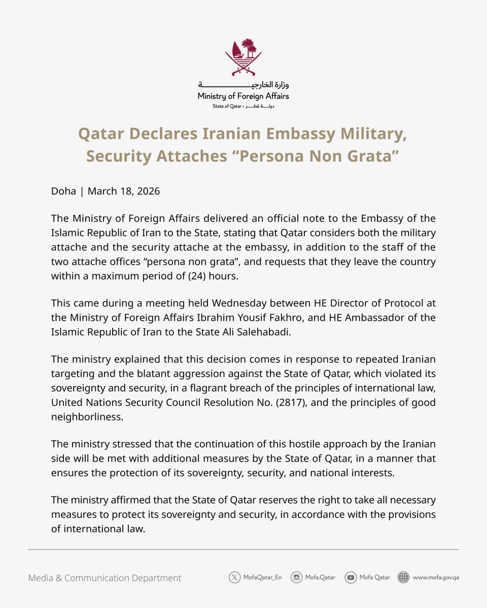 Trước đó vào tối 18/3, Bộ Ngoại giao Qatar đăng trên X cho biết đã tuyên bố các tùy viên quân sự và an ninh của Đại sứ quán Iran, cùng toàn bộ nhân viên trong các văn phòng này, gọi họ là những nhân vật không được hoan nghênh.