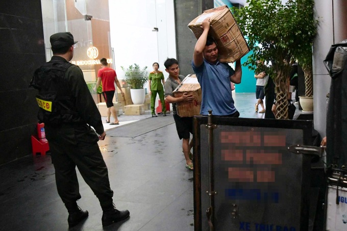 Nhiều thùng tài liệu được chuyển đi từ công ty NextTech trước sự giám sát của công an, tối 7/10. Ảnh: Linh Đan
