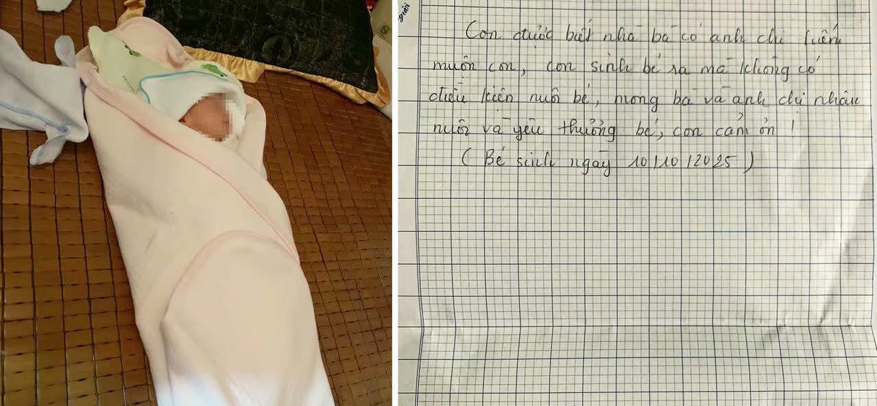 Một bé gái khoảng hơn 10 ngày tuổi được người dân xã Hương Khê (Hà Tĩnh) phát hiện bị bỏ lại bên cổng nhà lúc sáng sớm, kèm tờ giấy viết tay nói về hoàn cảnh người mẹ.