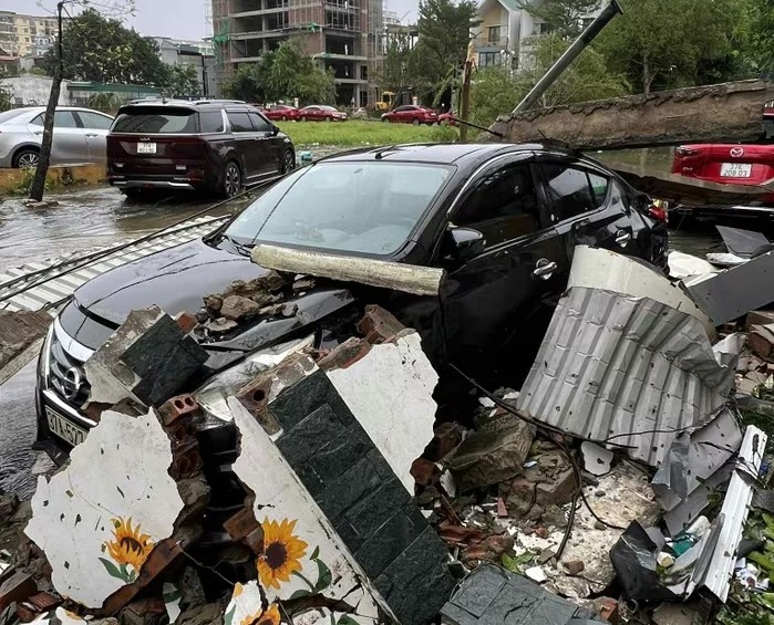 Bão Bualoi với sức gió khủng khiếp đã khiến hàng loạt phương tiện của người dân đậu bên đường bị hư hỏng nặng do cây, tường rào, mái tôn,… đổ sập đè lên.
