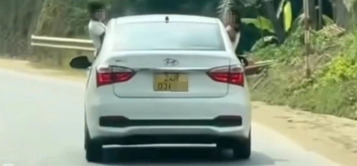 Anh V.V.H. (ở Lào Cai) lái ô tô để 2 trẻ em thò đầu ra ngoài, đu bám cửa ô tô khi xe đang chạy. Hình ảnh sau đó được người đi đường ghi lại và phản ánh tới cảnh sát giao thông.