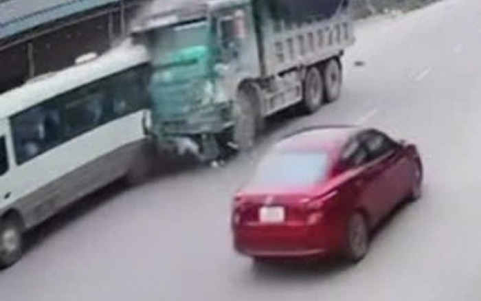 VIDEO: Xe ben tông xe 29 chỗ đưa đón học sinh, đẩy đi hàng chục mét