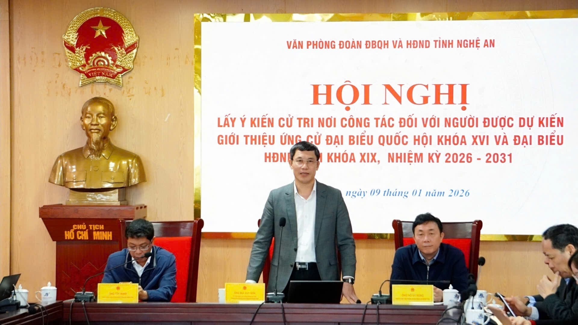 Nghệ An: Lấy ý kiến cử tri nơi công tác đối với người được giới thiệu ứng cử đại biểu Quốc hội Khóa XVI và đại biểu HĐND Ngày 9/1, Văn phòng Đoàn ĐBQH và HĐND tỉnh Nghệ An đã tổ chức hội nghị lấy ý kiến cử tri nơi công tác đối với người được giới thiệu ứng cử đại biểu Quốc hội Khóa XVI và đại biểu HĐND tỉnh Khóa XIX, nhiệm kỳ 2026–2031.