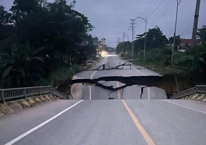 Sau khi nước lũ rút, cầu Tát Luông trên tuyến đường tránh xã Nà Hang, tỉnh Tuyên Quang bị sập một mố cầu.