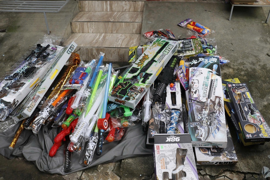 Ngày 24/9/2025, Công an phường Thành Vinh chủ trì phối hợp đoàn liên ngành phường Thành Vinh, tỉnh Nghệ An phát hiện và kịp thời thu giữ hàng trăm khẩu súng, kiếm, đao nhựa đồ chơi trẻ em nguy hiểm đã bị cấm mua bán, tàng trữ, sử dụng.