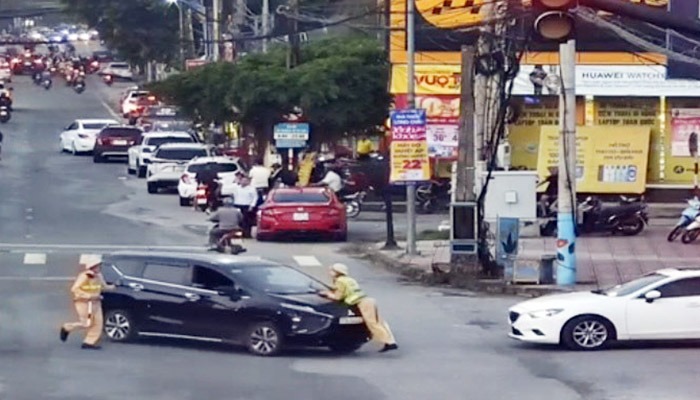 Thấy xe đang lao nhanh về phía mình, Thiếu tá Thọ đã bám vào nắp capo, tay phải sử dụng gậy chỉ huy điều khiển giao thông liên tục yêu cầu Lê Thành Công dừng xe lại.