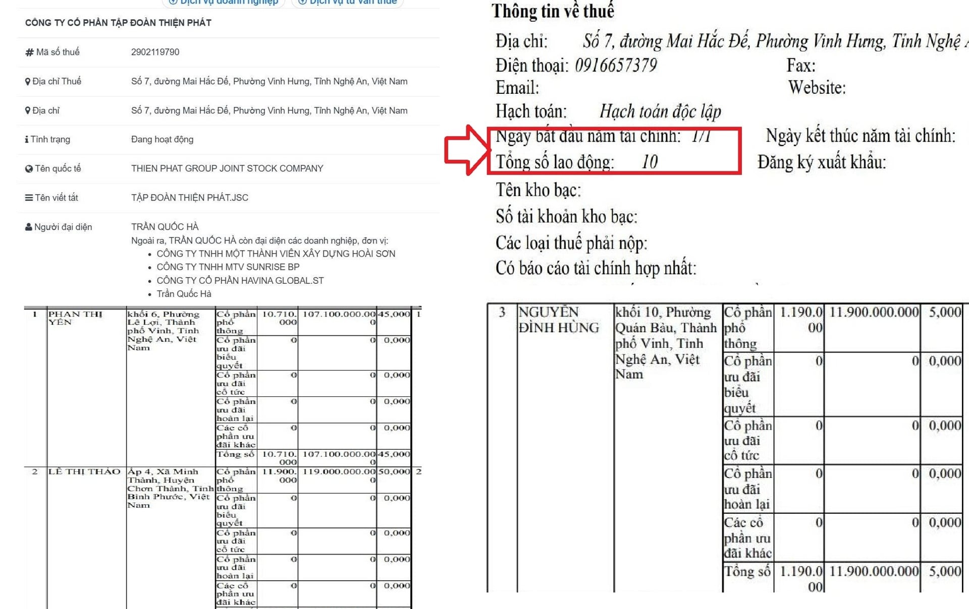 Đến đầu tháng 12/2025, vị trí người đại diện pháp luật kiêm Tổng giám đốc Công ty Cổ phần Tập đoàn Thiện Phát được chuyển sang ông Trần Quốc Hà (sinh năm 1983), hộ khẩu thường trú tại tỉnh Đồng Nai. Doanh nghiệp đăng ký quy mô lao động thường xuyên là 10 người.