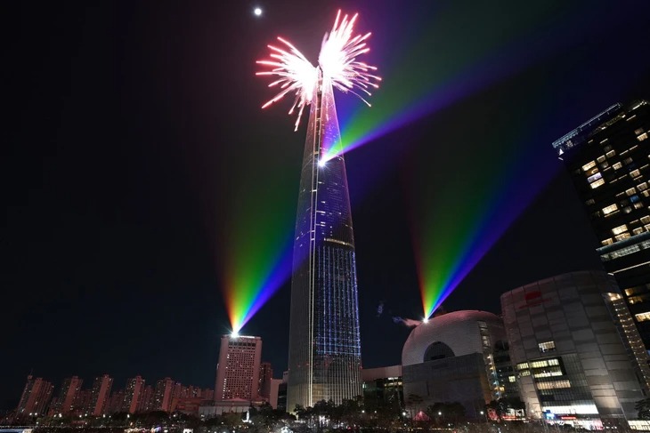 Pháo hoa thắp sáng bầu trời đêm phía trên tòa tháp Lotte World Tower, tòa nhà cao nhất Hàn Quốc ở Seoul, trong lễ đón năm mới rạng sáng 1-1-2026 (giờ địa phương) - Ảnh: AFP |