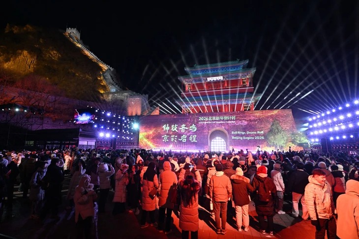 Người dân chờ đợi thời khắc đếm ngược lúc nửa đêm trong lễ đón năm mới tại Vạn Lý Trường Thành ở Bắc Kinh, Trung Quốc ngày 31-12-2025 - Ảnh: AFP |