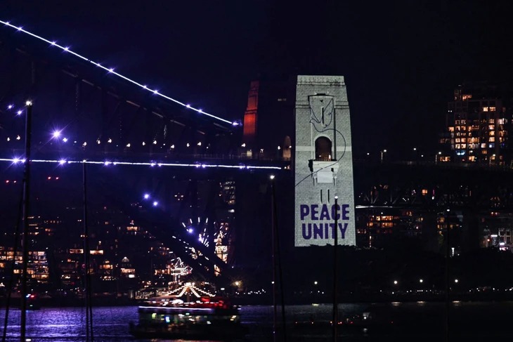 Thông điệp "Hòa bình, đoàn kết" được hiển thị trên trụ cầu cảng Sydney trước màn bắn pháo hoa lúc nửa đêm ở Sydney, Úc tối 31-12-2025 - Ảnh: AFP |