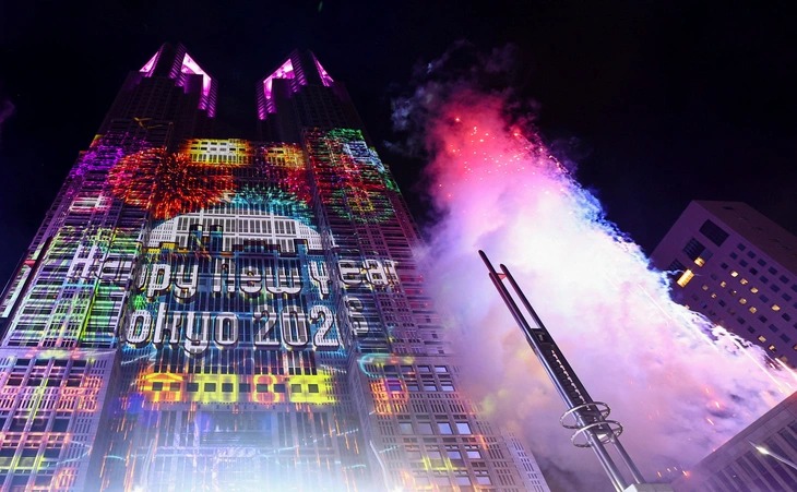 Pháo hoa rực rỡ cùng dòng chữ "Chúc mừng năm mới" được trình chiếu lên bề mặt Tòa nhà Chính quyền Thủ đô Tokyo để chào mừng năm mới tại Tokyo, Nhật Bản ngày 1-1-2026 - Ảnh: REUTERS |
