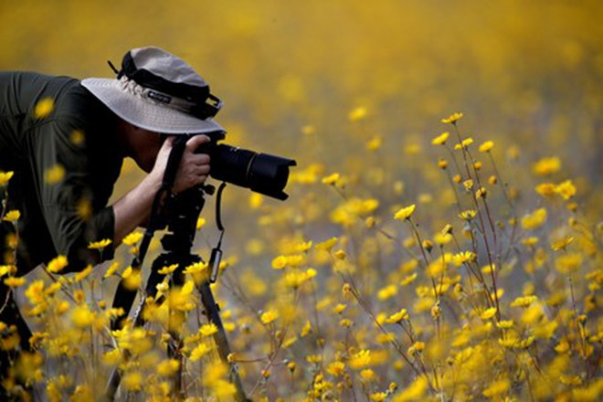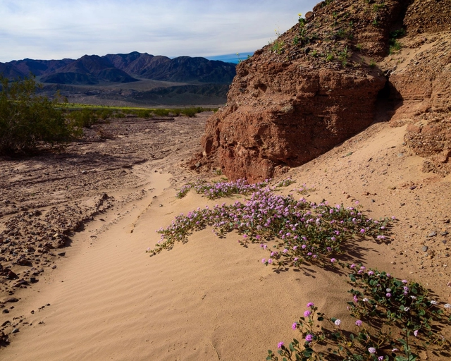 Những khóm hoa Sand Verbena, loại hoa mọc xen kẽ với Desert Gold - loài hoa vàng chủ yếu tạo nên sắc vàng tại thung lũng. Ảnh: SLR Lounge. |