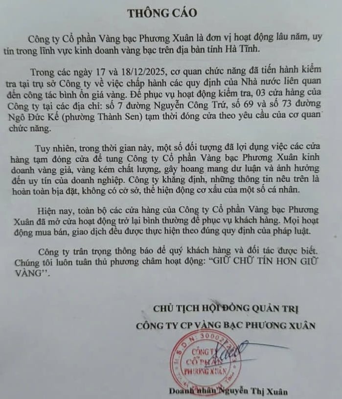 Trước làn sóng đồn đoán, Công ty Cổ phần Vàng bạc Phương Xuân đã dán thông báo tại các cửa hàng, khẳng định việc tạm đóng cửa là để phục vụ quá trình điều tra của cơ quan chức năng về thuế và một số vấn đề liên quan. Doanh nghiệp cũng phủ nhận các “tin đồn thất thiệt” liên quan đến việc bán vàng giả, cho rằng những thông tin này gây hoang mang dư luận và ảnh hưởng nghiêm trọng đến uy tín thương hiệu hơn 30 năm qua.