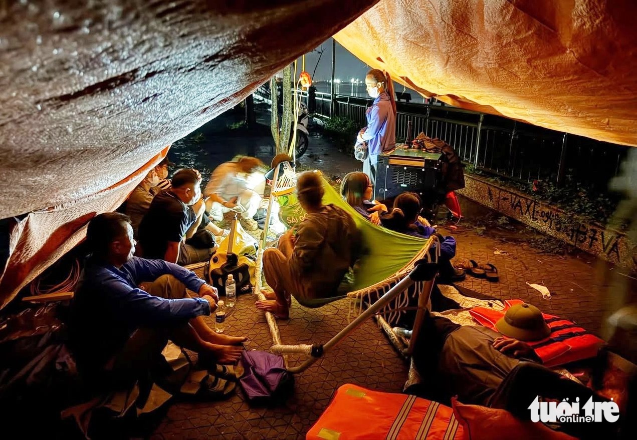 Trên bờ, nhiều người mang nước uống, thực phẩm tới hỗ trợ các đội dựng lều tạm tìm kiếm.