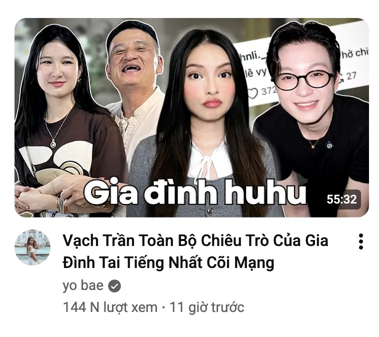Mới đây, Yo Bae (tên thật Hồ Hải Anh, SN 2000) - nữ YouTuber sở hữu hơn 500 nghìn người theo dõi đã thu hút sự chú ý đông đảo của cộng đồng mạng. Bởi cô mới đăng tải đoạn video dài gần 1 tiếng với tiêu đề: “Vạch trần toàn bộ chiêu trò của gia đình tai tiếng nhất cõi mạng”. Không những thế, Yo Bae còn “var” thẳng bằng cách đưa toàn bộ các thành viên trong gia đình này lên ảnh đại diện và không ngại bày tỏ quan điểm của mình.