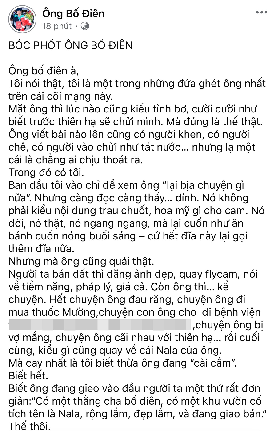 Còn Ông Bố Điên cũng đã “biên” một dòng trạng thái dài vào sáng nay, mỉa mai về việc bản thân bị “bóc phốt”. Song, cũng giống như nhiều bài viết khác, Ông Bố Điên vẫn cho rằng những người ghét mình là những người luôn theo dõi, thích xem mình nhất. Và dù mọi người có biết “chiêu trò”, có người khen hay chê thì mọi bài viết, hoạt động của Ông Bố Điên nói riêng và gia đình nói chung đều vẫn gây được sự chú ý và viral trên MXH.