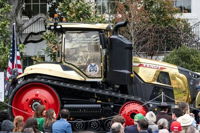 Trong buổi gặp mặt với các tổ chức nông dân tại Nhà Trắng, khu vực sân khấu chính còn gây chú ý với sự xuất hiện của một chiếc máy kéo dát vàng thật. |