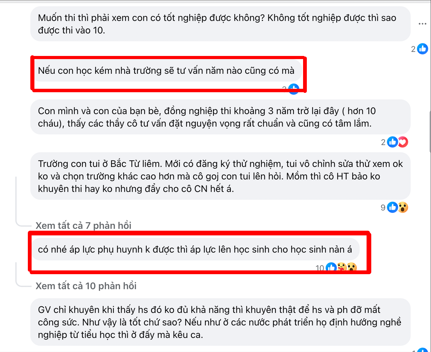 Tuy nhiên, bên cạnh đó cũng xuất hiện những ý kiến băn khoăn. Một số phụ huynh cho rằng có thể tồn tại áp lực từ phía nhà trường, gián tiếp tác động đến quyết định đăng ký nguyện vọng của học sinh. Thậm chí, có ý kiến phản ánh việc học sinh bị gọi lên trao đổi riêng khi lựa chọn nguyện vọng "cao hơn khả năng".