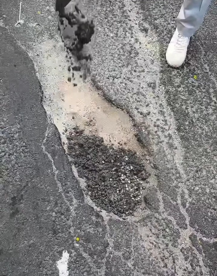 Sau khi hoàn tất, ông mang hỗn hợp xi măng đến ổ gà gần đó và tiến hành lấp lại, cố gắng làm phẳng mặt đường. Toàn bộ quá trình được thực hiện khá nhanh gọn.
