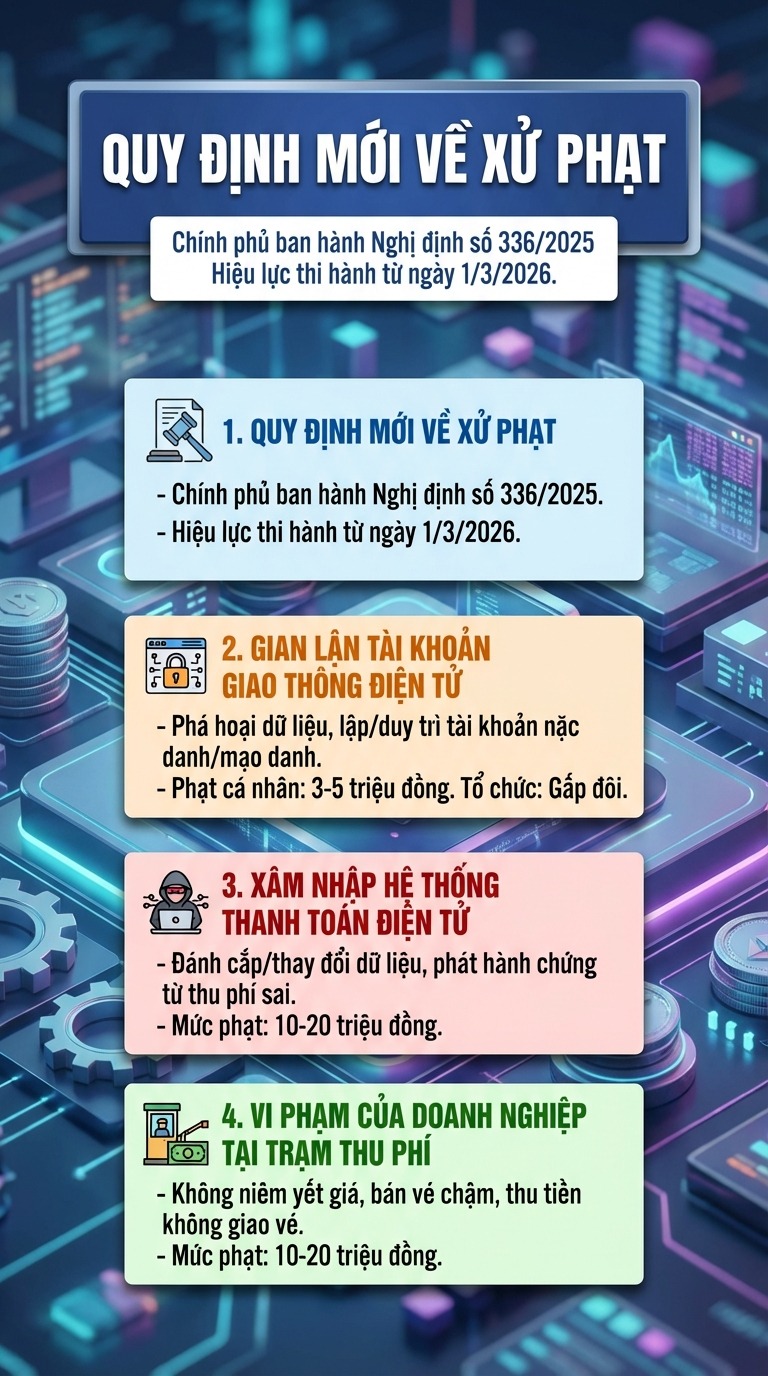 Chính phủ vừa ban hành Nghị định số 336/2025 quy định về xử phạt vi phạm hành chính trong hoạt động đường bộ, có hiệu lực từ ngày 1/3/2026. So với quy định trước đây, nhiều hành vi sẽ bị xử lý với mức tiền phạt cao hơn, đặc biệt trong lĩnh vực thanh toán điện tử giao thông, kinh doanh vận tải và cho thuê xe tự lái.