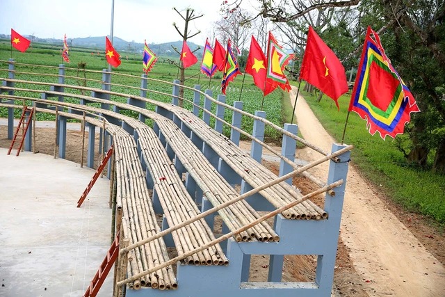 Sân vận động tre 2.000 chỗ ngồi nổi bật giữa không gian làng quê, trở thành điểm nhấn của lễ hội năm nay. Sân đang được kiểm tra và hoàn tất nhưng khâu cuối cùng để chuẩn bị cho ngày khai hội sẽ diễn ra vào 19/3. |