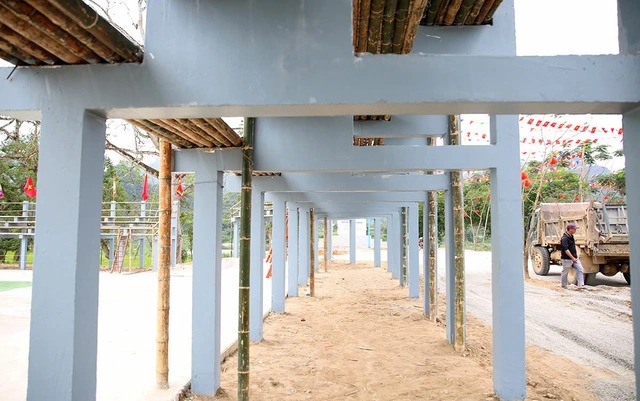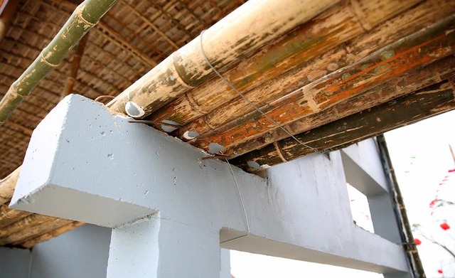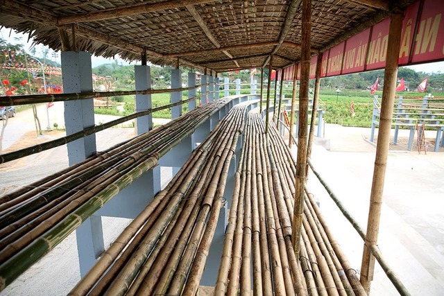 Phần móng và hệ trụ bê tông nâng đỡ toàn bộ khán đài, trong khi các hạng mục phía trên được hoàn thiện bằng vật liệu tre, nứa. |
