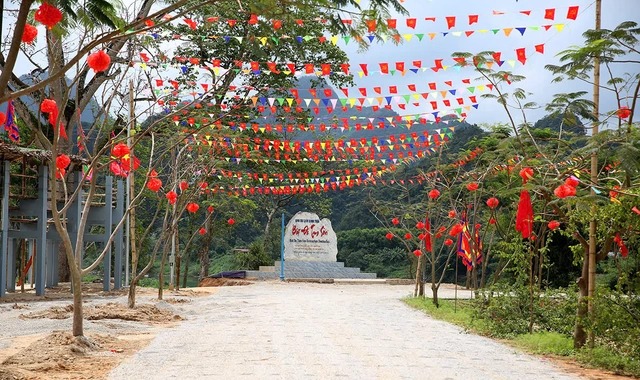 Lối vào khu vực lễ hội rực rỡ cờ hoa, mang đậm không khí truyền thống vùng quê Nghệ An. |