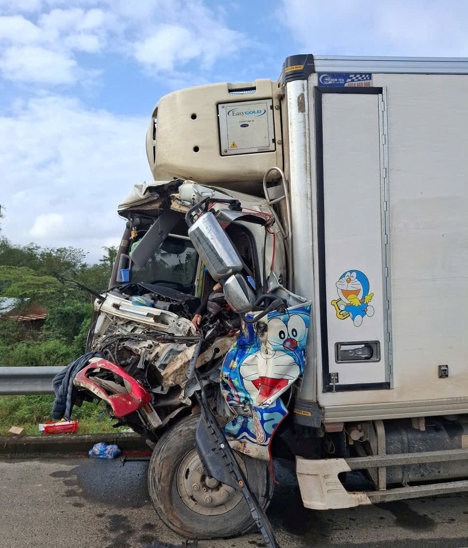 Cú va chạm mạnh khiến phần đầu xe tải biến dạng hoàn toàn, tài xế bị kẹt trong cabin và tử vong tại chỗ. Xe đầu kéo bị hư hỏng nhẹ ở đuôi rơ-moóc.