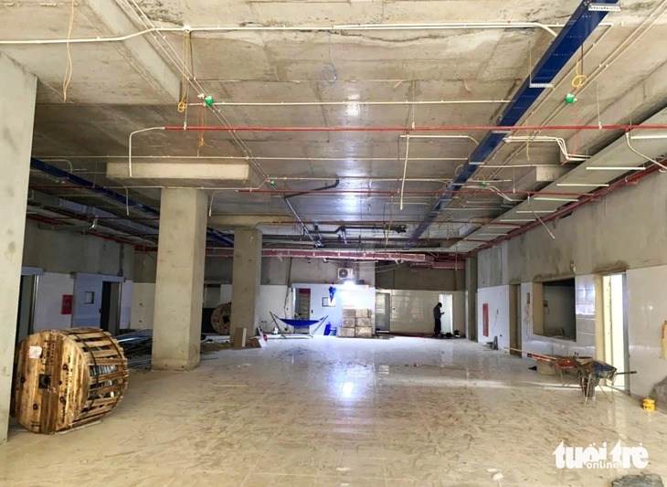 Khung cảnh thi công còn dở dang bên trong tòa nhà Trung tâm Sản nhi - Ảnh: LÊ MINH |
