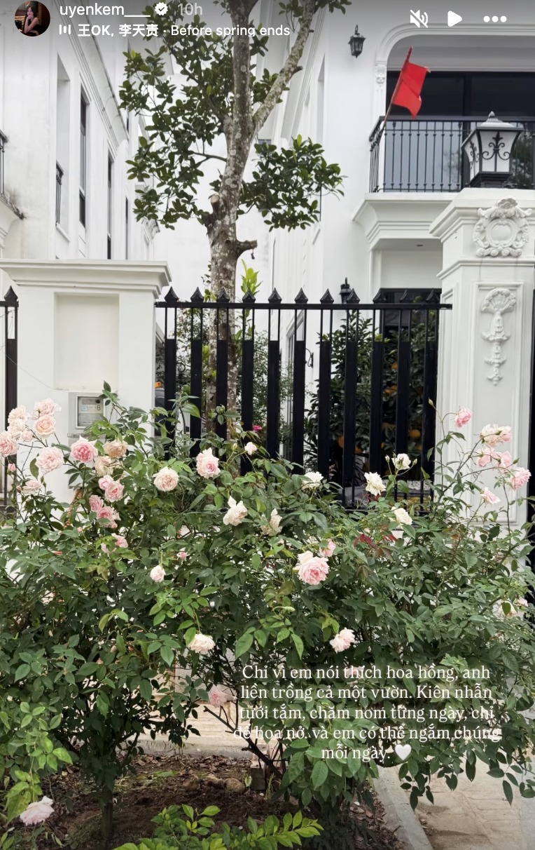 Mới đây, nhân dịp 8.3, nàng WAG Ngô Tố Uyên - vợ Thành Chung hạnh phúc chia sẻ lên MXH khoảnh khắc chụp khu vườn rực rỡ nằm căn biệt thự mới toanh của hai vợ chồng. Điều khiến nhiều người chú ý là cả một vườn hoa hồng được trồng ngay ngắn trước nhà, nở rực rỡ với đủ sắc hồng dịu dàng. Đi kèm hình ảnh, bà xã Thành Chung tiết lộ câu chuyện vô cùng dễ thương: