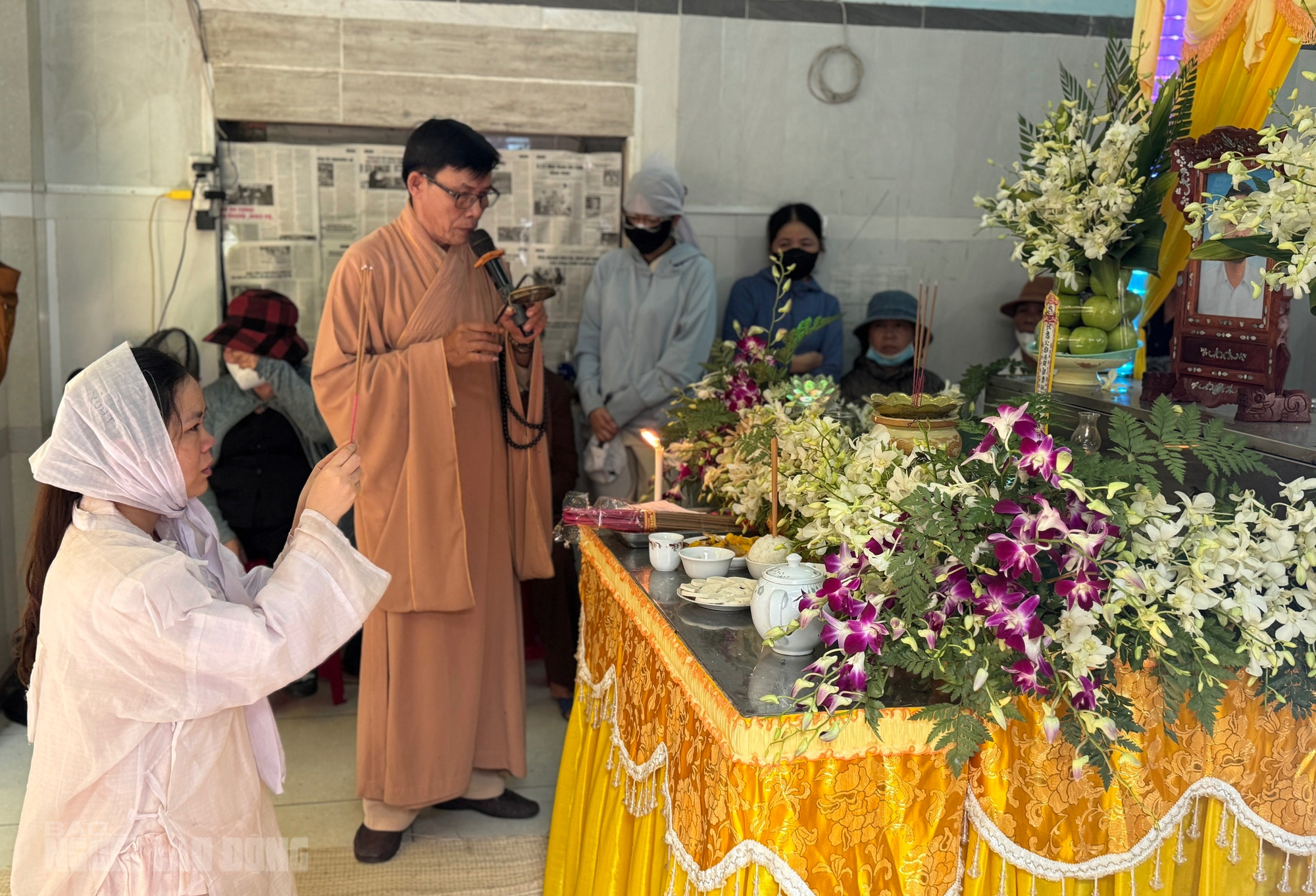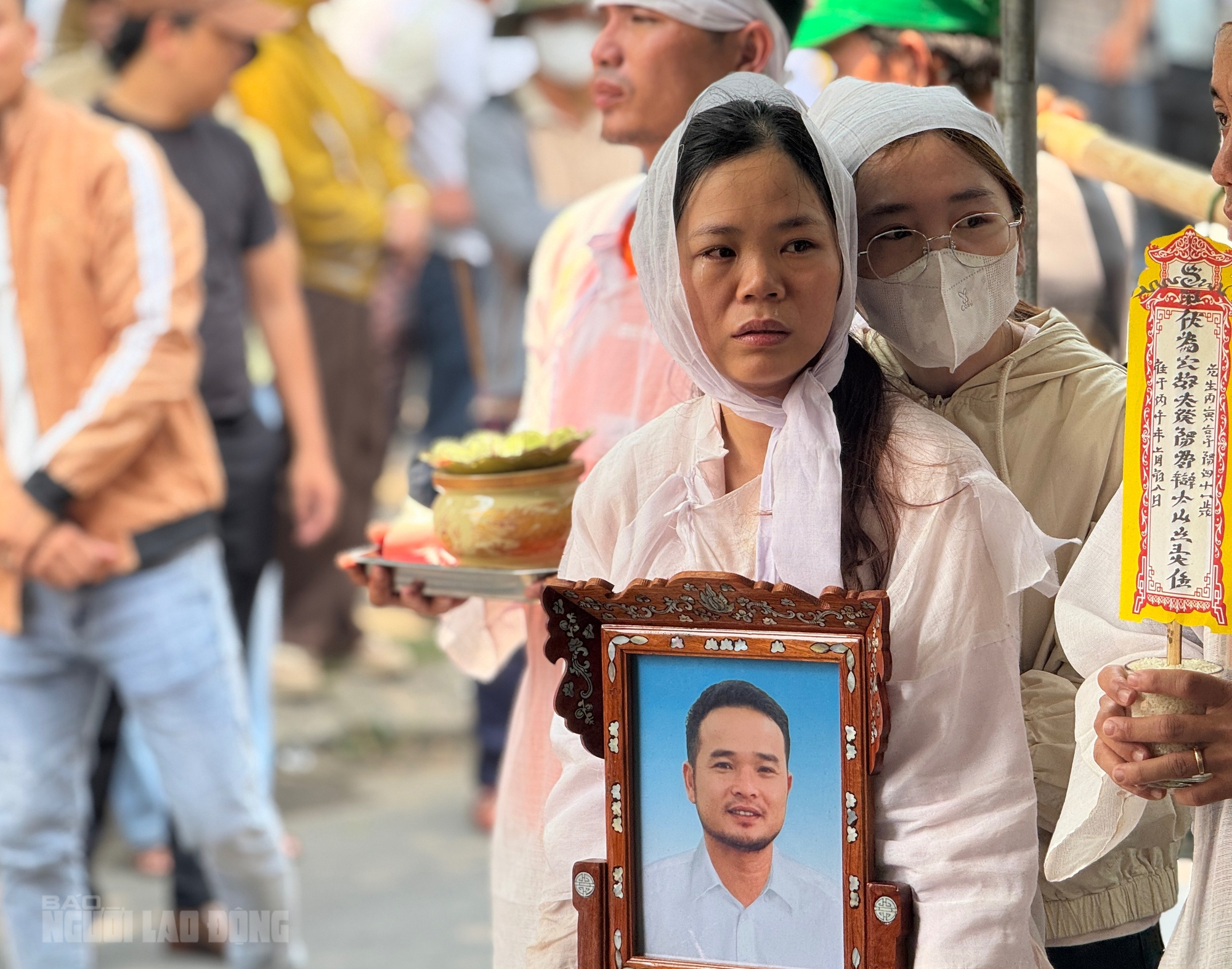 Trước linh cữu, vợ anh Sơn gần như kiệt quệ, đôi mắt đỏ hoe. Suốt lễ tang, chị ngồi lặng bên quan tài chồng, nỗi đau hiện rõ trong từng ánh nhìn, cử chỉ.