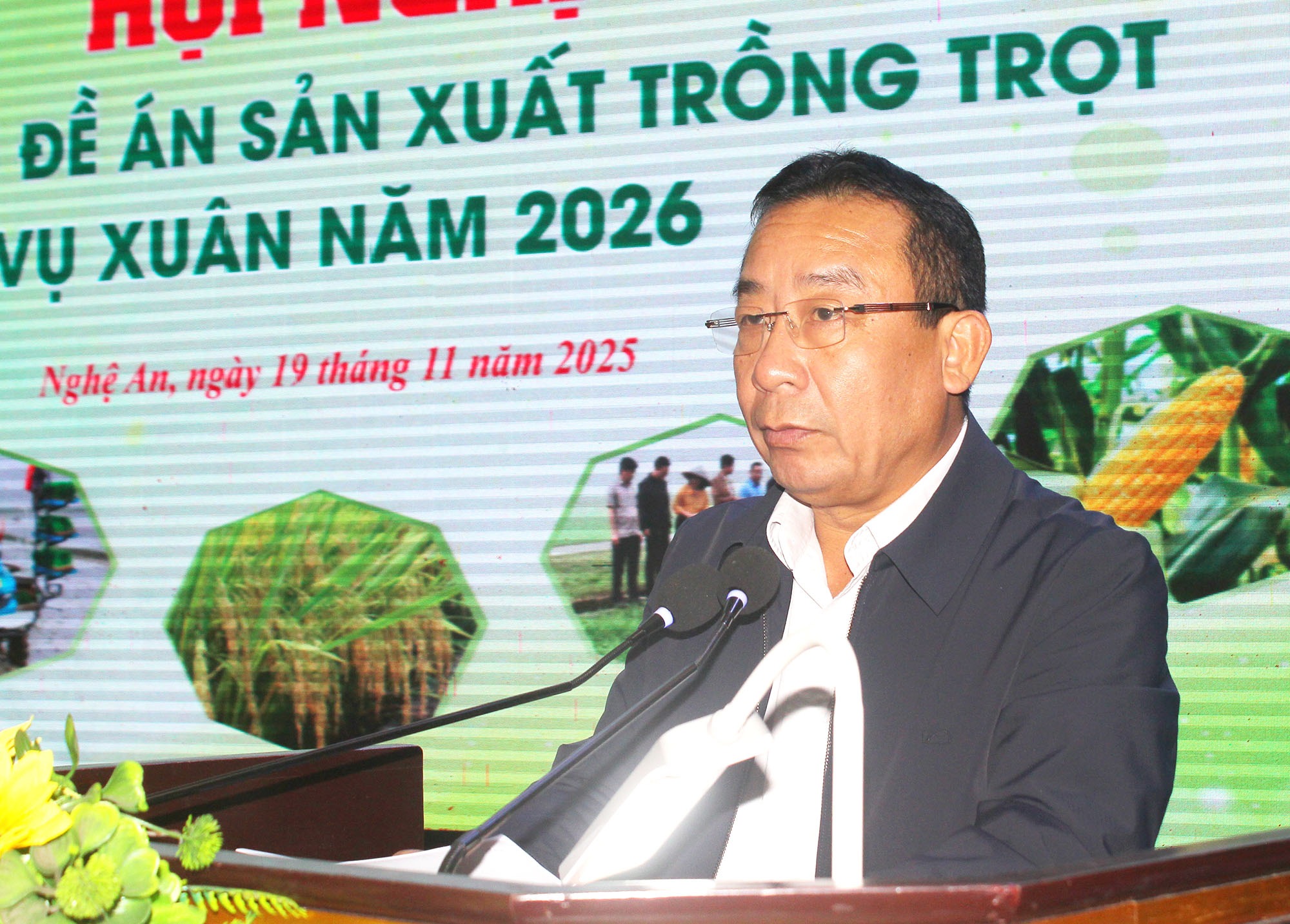 Tại Hội nghị, ngành Nông nghiệp và Môi trường đã đề ra các giải pháp cụ thể để có thể sản xuất an toàn và hiệu quả trong vụ Đông Xuân 2025-2026 như: Bố trí cơ cấu giống và thời vụ đối với cây trồng, đặc biệt là đối với lúa, ngô, lạc, mía, sắn, rau các loại. Trong đó, các địa phương phải căn cứ thời gian sinh trưởng của các giống để bố trí lịch gieo mạ phù hợp. Đối với giống, chỉ đưa vào cơ cấu các giống lúa đã được công nhận chính thức, công nhận lưu hành và làm mô hình có kết quả tốt tại Nghệ An. Mỗi địa phương nên chọn 02- 03 giống lúa lai và 02 - 03 giống lúa thuần để đưa vào cơ cấu sản xuất; phân bón; công tác bảo vệ thực vật, công tác thuỷ lợi; công tác vệ sinh đồng ruộng; ứng dụng tiến bộ khoa học kỹ thuật, chuyển đổi cơ cấu cây trồng, liên kết sản xuất; nhân rộng các mô hình an toàn theo tiêu chuẩn VietGAP, hữu cơ và phát triển sản xuất trồng trọt giảm phát thải, tạo lập tín chỉ Cacbon…