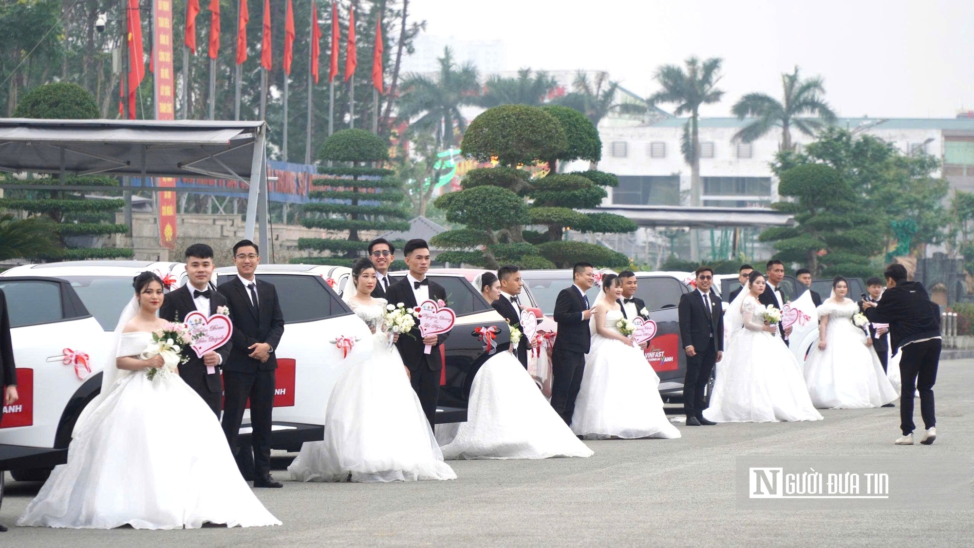 Các cặp đôi nở nụ cười rạng rỡ chuẩn bị lên xe hoa đi vòng qua những tuyến phố trung tâm và về nơi tổ chức sự kiện. Trước đó, để chuẩn bị cho lễ cưới, các cặp đôi tham gia đã được ban tổ chức hỗ trợ đầy đủ các hạng mục như: nhẫn cưới, hoa cô dâu, bánh cưới, tiệc ngọt, trang điểm, chụp ảnh, quay phim và một bộ chăn màn. |