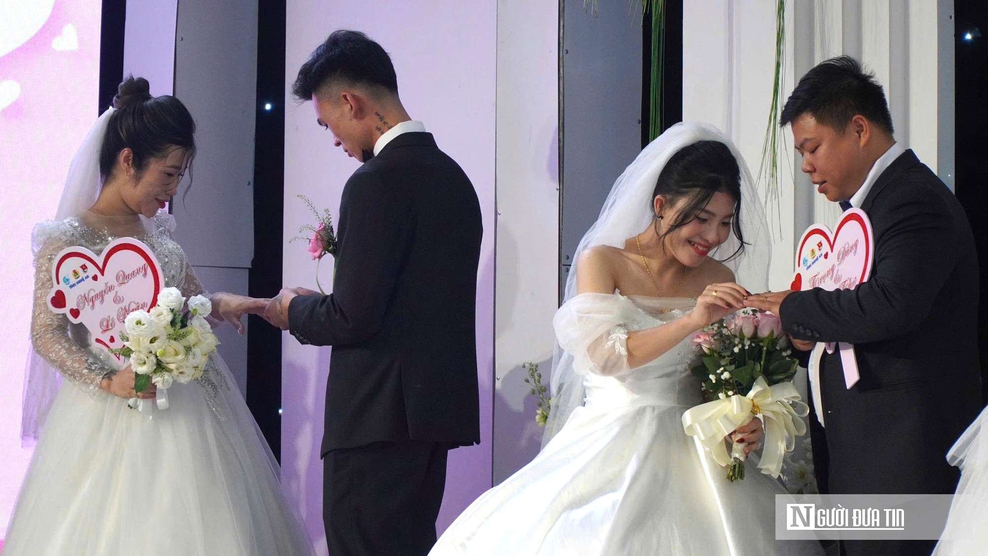 Các cặp đôi được ban tổ chức trao tặng cặp nhẫn vàng tại lễ cưới. “Hai vợ chồng đều là công nhân xa nhà, thu nhập chỉ đủ trang trải cuộc sống nên chưa dám nghĩ đến một đám cưới đàng hoàng. Hôm nay được Công đoàn tổ chức lễ cưới chu đáo thế này, chúng tôi thực sự rất hạnh phúc và biết ơn”, Đào Thị Quỳnh, công nhân Công ty TNHH Luxshare-ICT Nghệ An không giấu được cảm xúc của mình. |